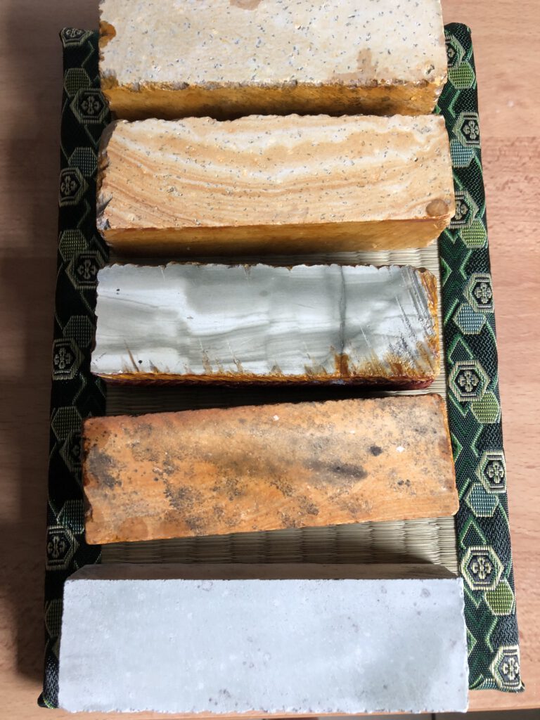Nakato, medium stones are the biggest section in natural whetstones mined in Japan. Many are tuff or other volcanic rock. The picture above sports different whetstones from the Aizu region in Fukushima prefecture. They were quite popular for sharpening kitchen knives and farm utensils but a cold winter in the 1950s meant that farmers doing extra work in winter by shaping and polishing whetstones, kept the windows closed, resulting in silicosis and a slow death, factually ending the whetstone industry in Aizu. Medium stones are the main tool to sharpen knives before polishing them on finer ones.