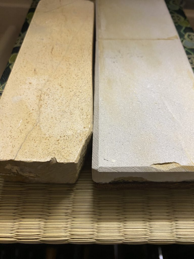 Some stones like the Jôkyôji from Fukui have become rare already during the Edo period and an Ersatz was then found in the Kazama stone from Yamagata, renamed Kaisei “Ersatz” (pictured above), as the Jôkyôji was a must-have in Katana sharpening. Later, even the Kaisei was replaced by synthetic Kaisei.